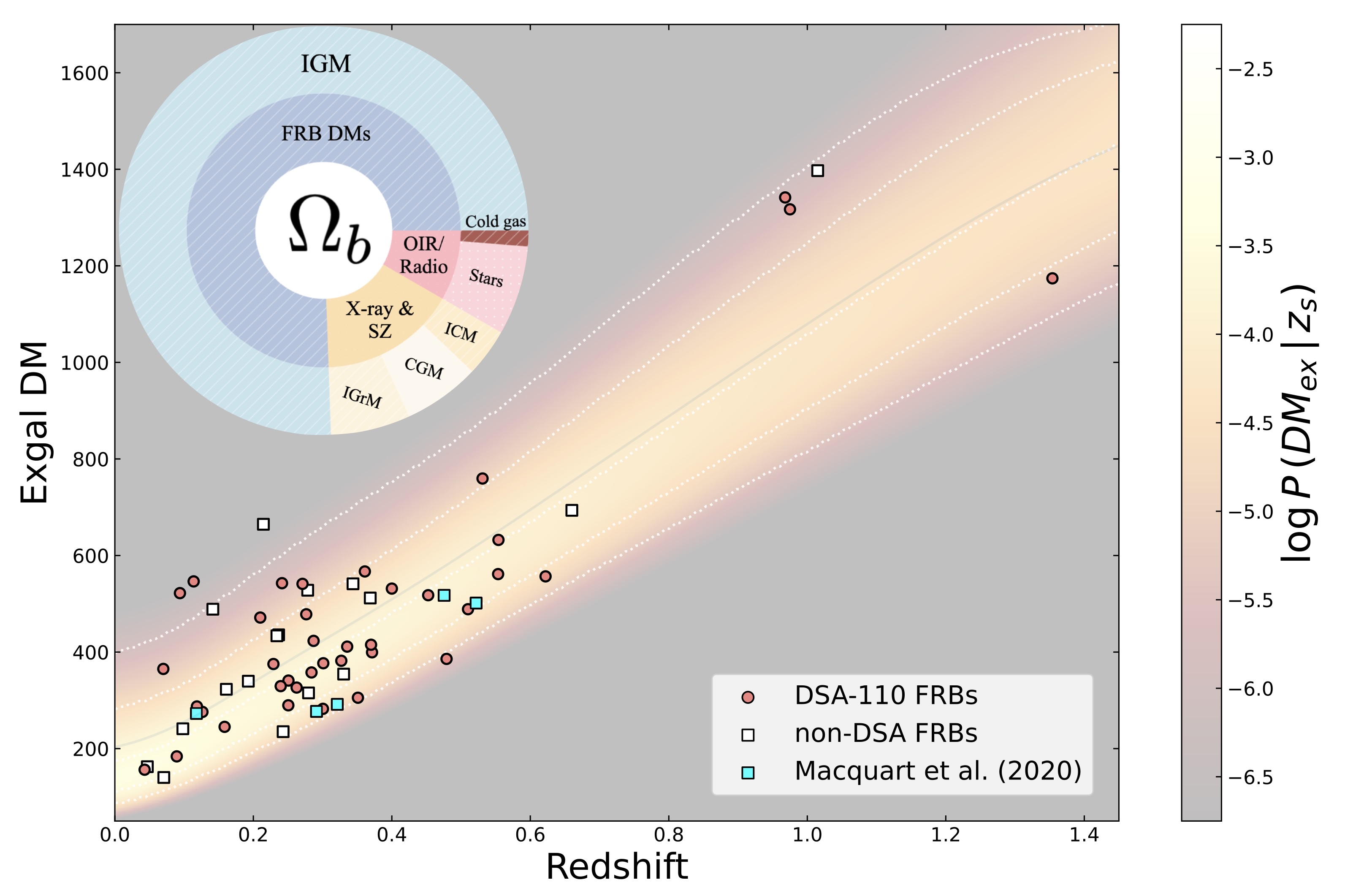 Approximately half of the Universe's dark matter resides in collapsed halos; significantly less than half of the baryonic matter (protons and neutrons) remains confined to halos. A small fraction of baryons are in stars and the interstellar medium within galaxies. The lion's share are diffuse (<10−3 cm−3) and ionized (neutral fraction <10−4), located in the intergalactic medium (IGM) and in the halos of galaxy clusters, groups, and galaxies. This diffuse ionized gas is notoriously difficult to measure, but has wide implications for galaxy formation, astrophysical feedback, and precision cosmology. Recently, the dispersion of extragalactic Fast Radio Bursts (FRBs) has been used to measure the total content of cosmic baryons. Here, we present a large cosmological sample of FRB sources localized to their host galaxies. We have robustly partitioned the missing baryons into the IGM, galaxy clusters, and galaxies, providing a late-Universe measurement of the total baryon density of Ωbh70=0.051±0.006. Our results indicate efficient feedback processes that can deplete galaxy halos and enrich the IGM (fIGM=0.76±0.11), agreeing with the baryon-rich cosmic web scenario seen in cosmological simulations. Our results may reduce the "S8 tension" in cosmology, as strong feedback leads to suppression of the matter power spectrum.